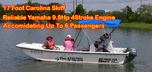 . Bring your dog play games and enjoy a day on the bay. We feature Carolina Skiff boats all with Mercury Motors. Jersey shore bed and breakfast.We clean and inspect every boat before turning it over to a customer for use. Looking for a fun summer adventure thats good for the whole family. This boat holds up to 5 passengers and is operated with 99 horsepower Yamaha engine with a steering middle console.